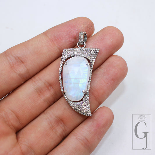 Shark Tooth Moonstone Pendant with Rose Cut Pave Diamonds | 925 Sterling Silver Handmade Charm | Unique Gemstone Pendant