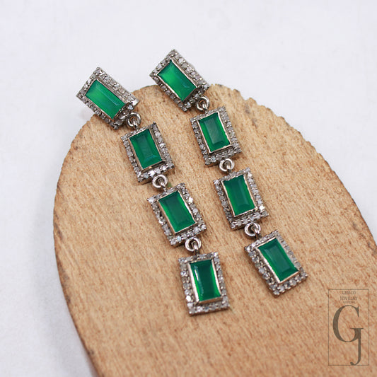 Beautiful Green Onyx Dangle Earrings – 925 Sterling Silver with Rose Cut Pave Diamonds | Handmade Drop Design Statement Earrings
