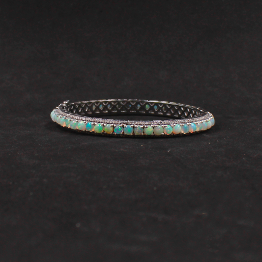 Natural Ethiopian Opal Bangle With Blue Sapphires And Pave Diamonds – 925 Sterling Silver Handmade Finish Luxury Jewelry – Gift for Her