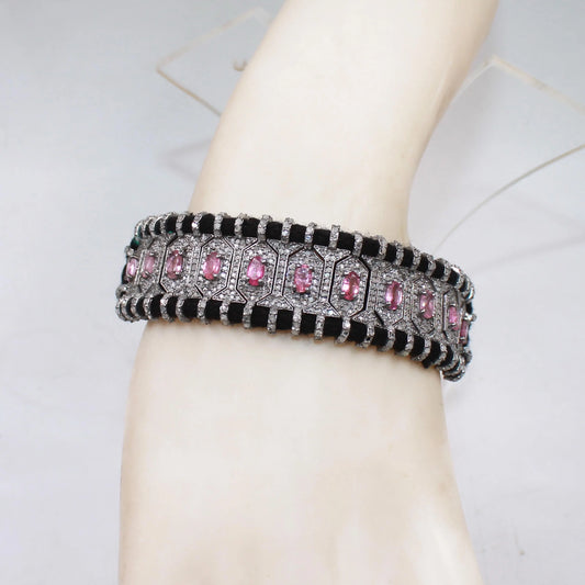 Natural Pink Tourmaline Bracelet – 925 Sterling Silver Adjustable Bracelet with Rose Cut Diamonds | Handmade Jewelry Gift for Her