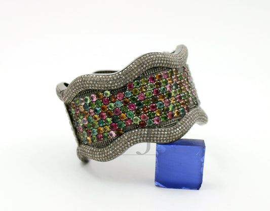 Antique Oxidized Finish Tourmaline Designer Bangle Rosecut Pave Diamond Bangle 925 Sterling Silver Handmade Finish Diamond Bangle Bracelet