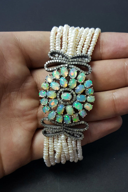 Beautiful Designer Rosecut Pave Diamond Bracelet 925 Sterling Silver Handmade Finish Opal And Pearl Diamond Bracelet Jewelry