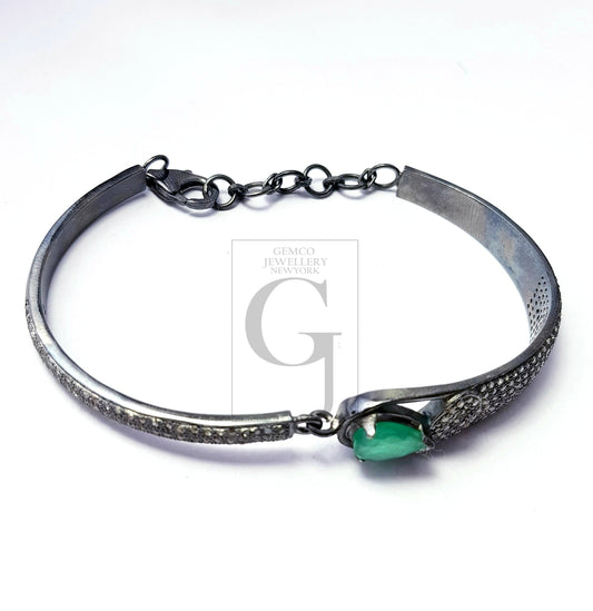 Rocecut pave diamond bangle 925 sterling silver handmade finish beautiful tear drop emerald stone diamond bangle