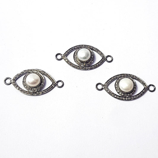 Beautiful Pearl Evil Eye Diamond Charm Pave Diamond Rosecut Connector 925 Sterling Silver Connector Handmade Diamond Bracelet Connector