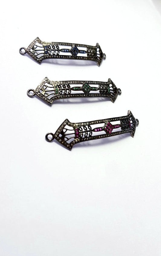 Antique Look Rosecut Pave Diamond Bracelet Connector 925 Sterling Silver Handmade Finish Blue Sapphire/Ruby/Emerald Diamond Connector Charms