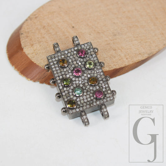 Antique Look Multi Tourmaline Diamond Bracelet Connector Handmade 925 Sterling Silver Jewelry Pave Diamond Accessories In Emerald & Citrine