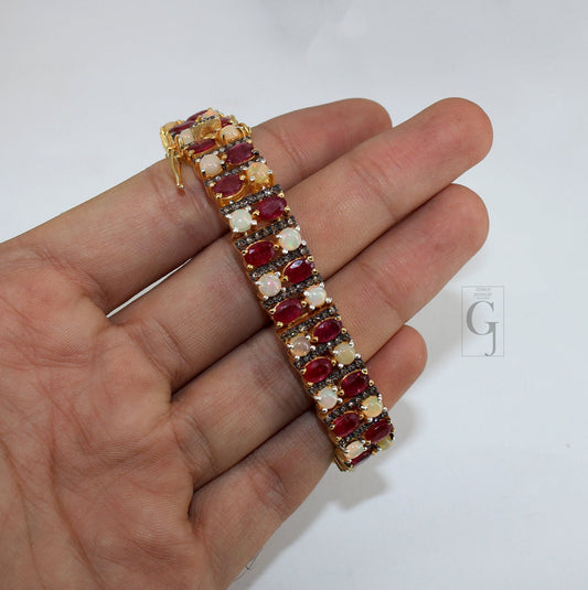 14k Gold Finish Red Ruby And Opal Bracelet Jewelry Rosecut Pave Diamond Bracelet 925 Sterling Silver Handmade Finish Diamond Bangle Bracelet