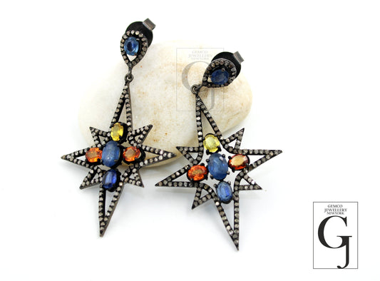 Starburst Multi Sapphire Designer Earring Rosecut Pave Diamond Earrings 925 Sterling Silver Handmade Silver Finish Sapphire Diamond Earrings