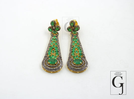 Traditional designer AAA emerald earring 14k gold Rosecut pave diamond earrings 925 sterling silver handmade silver finish diamond earring