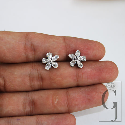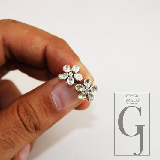 Slice Diamond, Polki Designer Studs Tops Earring Rosecut Pave Diamond Earrings 925 Sterling Silver Handmade Silver Finish Diamond Earring