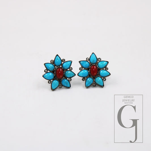 Sleeping Beauty Arizona Turquoise And Coral Rosecut Diamond 925 Sterling Silver Handmade Very Beautiful Diamond Pave Stud Earrings jewelry