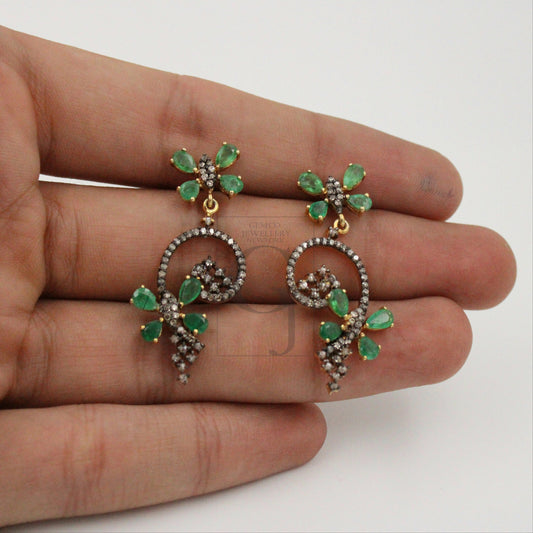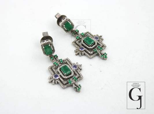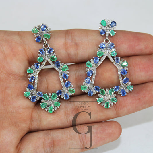 Beautiful Designer Emerald And Sapphire Earring Rosecut Pave Diamond Earrings 925 Sterling Silver Handmade Silver Finish Diamond Earring