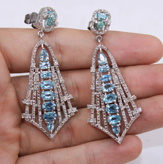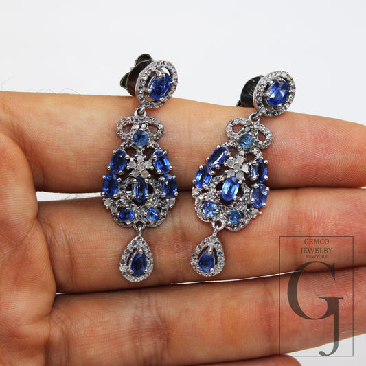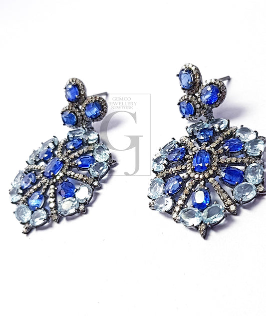 Beautiful Designed Earrings With Blue Topaz And Kaynite Stone Pave Rosecut Diamond 925 Sterling Silver Handmade Pave Diamond Earring