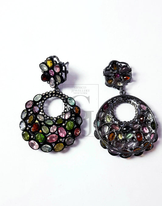 Beautiful Designer Multi Tourmaline Fashionable Rosecut Pave Diamond Earrings 925 Sterling Silver Handmade Silver Finish Diamond Earrings