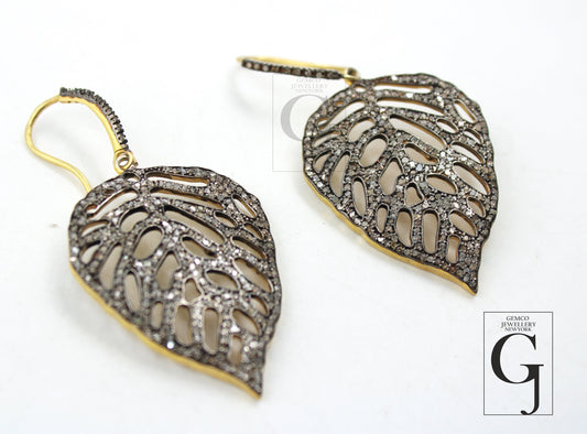 Beautiful Leaf Shaped Diamond Earrings Rosecut Pave Diamond Earrings 925 Sterling Silver Handmade Silver Finish Diamond Earrings