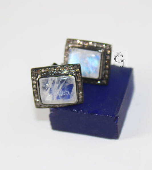 Beautiful Designer Rosecut Pave Diamond Stud Earrings 925 Sterling Silver Handmade Silver Finish Moonstone Diamond Stud Earrings Charms