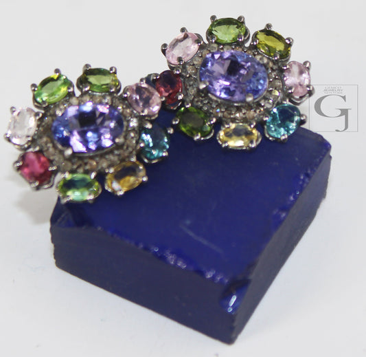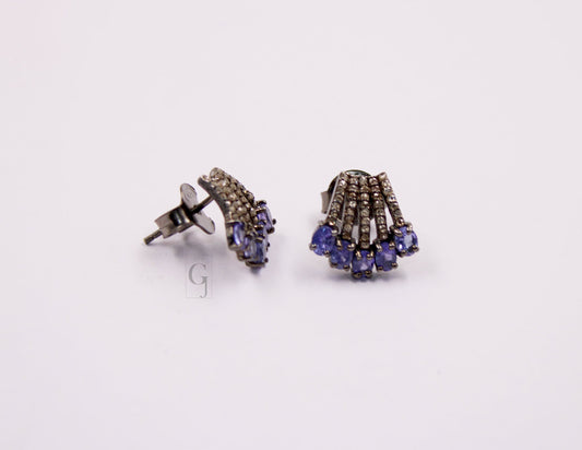 Beautiful Designer Tanzanite Stud Earrings Tops Pave Rosecut Diamond 925 Sterling Silver Handmade Diamond Pave Stud Earrings