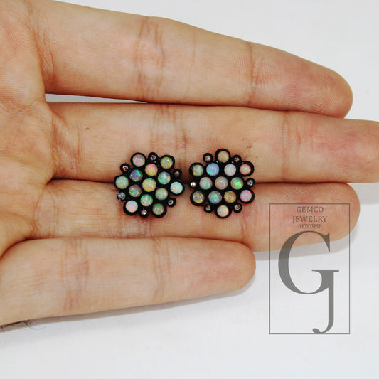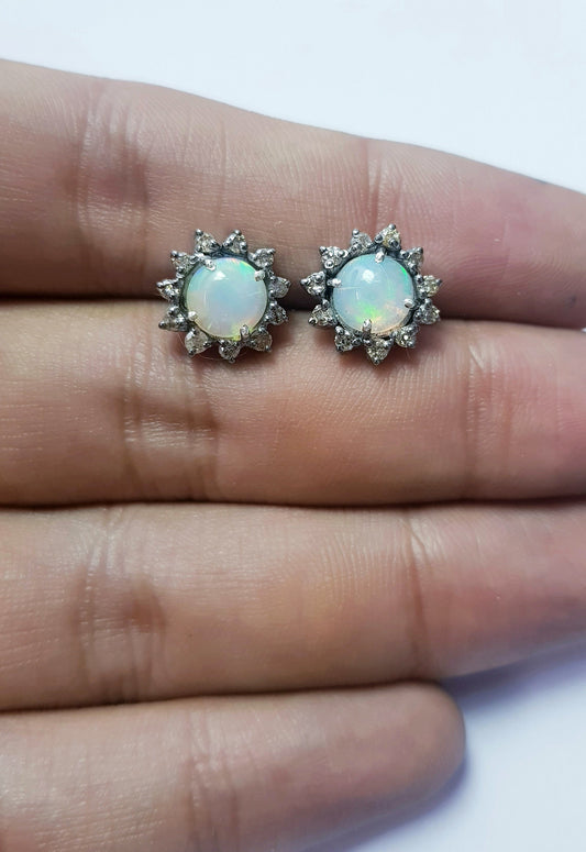 Beautiful Opal Designer Rosecut Pave Diamond Stud Earrings 925 Sterling Silver Handmade Silver Finish Diamond Stud Earrings