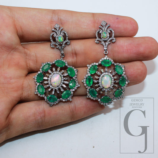 Beautiful Opal Emerald Designer Earring Rosecut Pave Diamond Earrings 925 Sterling Silver Handmade Silver Finish Baguette Diamond Earring