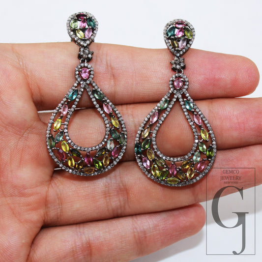 Beautiful Multi Tourmaline Designer Rarring Rosecut Pave Diamond Earrings 925 Sterling Silver Handmade Silver Finish Diamond Earring Jewelry