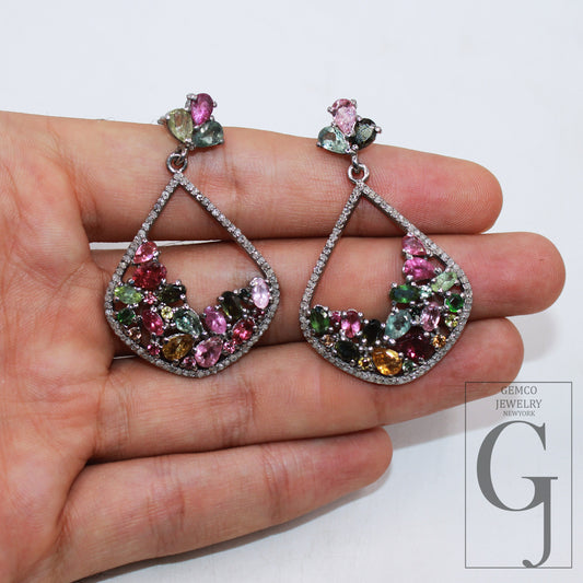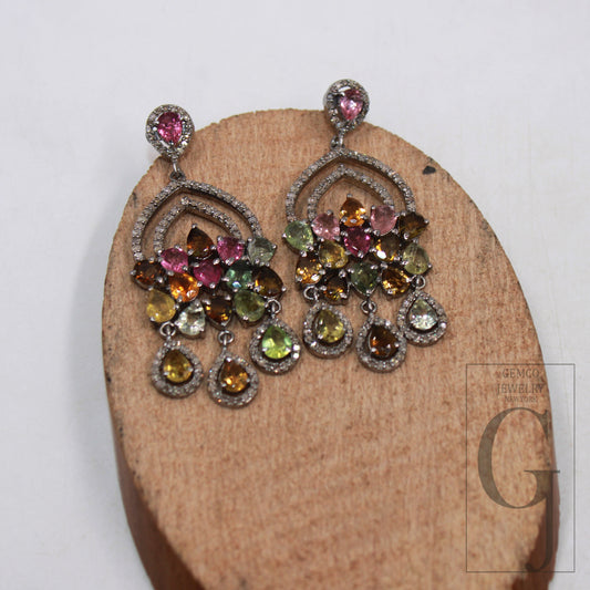 Beautiful Multi Tourmaline Designer Earring Rosecut Pave Diamond Earrings 925 Sterling Silver Handmade Silver Finish Diamond Earring Jewelry