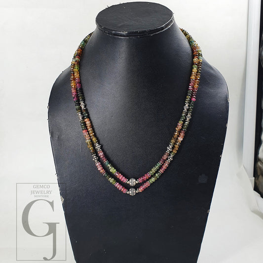 16" AAA Quality Multi Tourmaline Rondels 925 Silver 2 String Necklace Antique Silver Beads Findings Spacers Ready To Eear Handmade Jewelry
