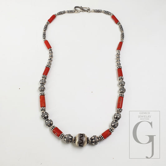 16" AAA Quality Natural Coral 925 Silver Necklace Handmade Jewelry, Antique Look Oxidized Beaded Necklace, Stone Beads Designers Choice