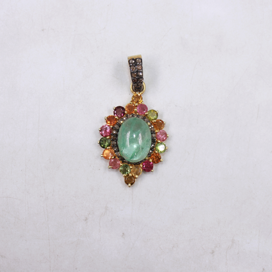 Natural Barriel Emerald & Multi Tourmaline Pendant With Rosecut Pave Diamonds – Gold Plated 925 Sterling Silver Handmade Luxury Jewelry