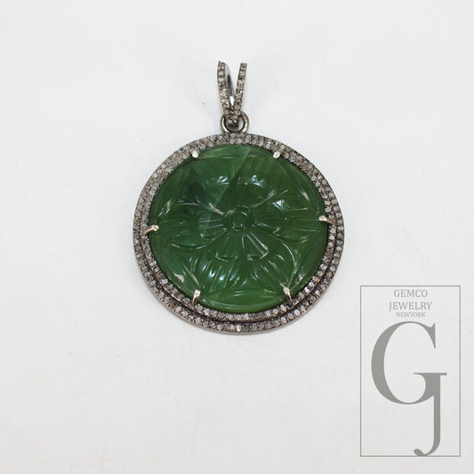 Hand carved Natural green aventurine pendant designer Rosecut pave diamond sterling 925 silver handmade finish diamond necklace pendant
