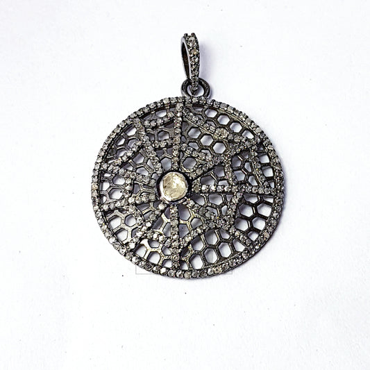 Beautiful Circle Shaped Flat Diamond Spider Web Designed Rocecut Pave Diamond Pendant 925 Sterling Silver Handmade Finish Diamond Jewelry