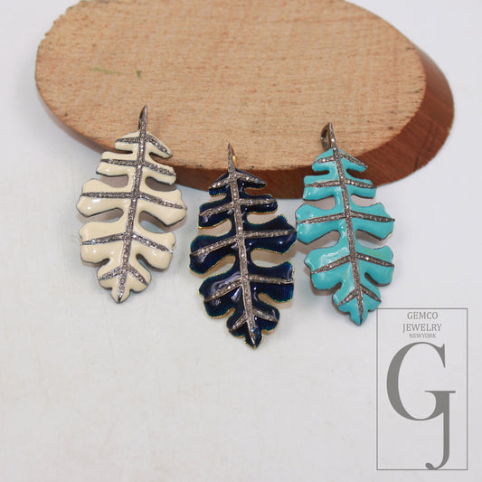 1pc Enamel Leaf Pendant Pave Diamond Rosecut Pendant 925 Sterling Silver Finish Handmade Diamond Pendant Necklace Jewelry Enameling Jewelry