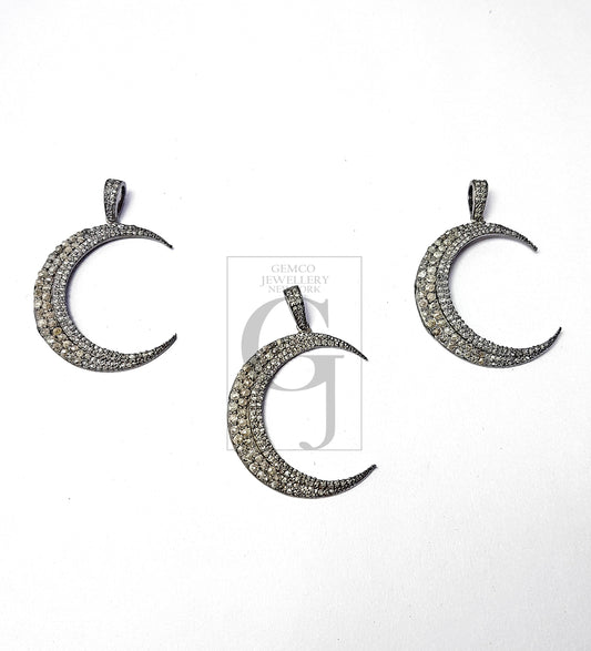 Antique Look Crescent Moon Pendant Design Diamond Pendant Pave Diamond Rosecut Pendant 925 Sterling Silver Pendant Handmade Diamond Pendant