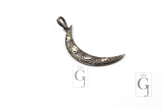 Slice Diamond Crescent Moon Designer Pendant Rosecut Pave Diamond Pendant 925 Sterling Silver Handmade Finish Diamond Charm Necklace Pendant