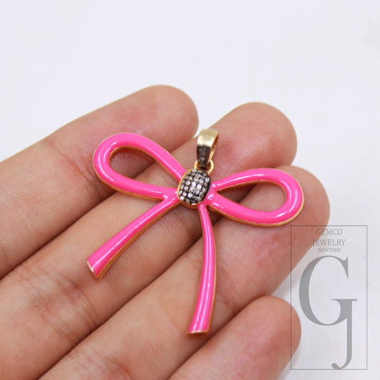 Beautiful Pink Enamel Bow Pendant Designer Rosecut Pave Diamond Pendant Sterling 925 Silver Handmade Diamond Charm Necklace Pendant Jewelry