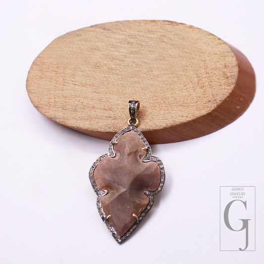 Shark Tooth Moonstone Pendant with Rose Cut Pave Diamonds | 925 Sterling Silver Handmade Charm | Unique Gemstone Pendant