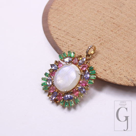 Flower Design Multi Stone And Rainbow Moonstone Pave Rosecut Diamond Pendant Handmade Finish Diamond Pendant