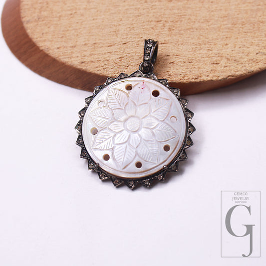 Flower Carving Pearl Stone & Pave Rosecut Diamond Pendant in 925 Silver