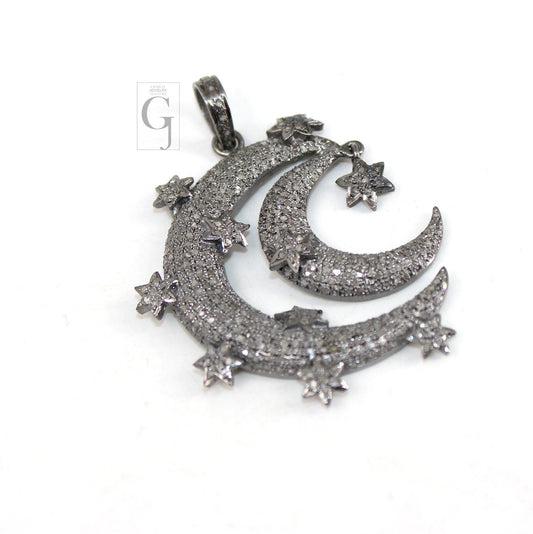 Antique Crescent Moon Star Pendant Designer Rosecut Pave Diamond Pendant 925 Sterling Silver Handmade Finish Design Diamond Jewelry Necklace