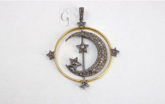 Spinning Moon And Star Pendant Designer Rosecut Pave Diamond Pendant Sterling 925 Silver Handmade Finish Diamond Charms Necklace Pendant