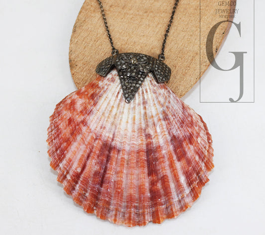 Beautiful Jumbo Scallop Red Sea Shell Pendant Rosecut Pave Diamond Pendant 925 Sterling Silver Finish Diamond Charms Necklace Pendant