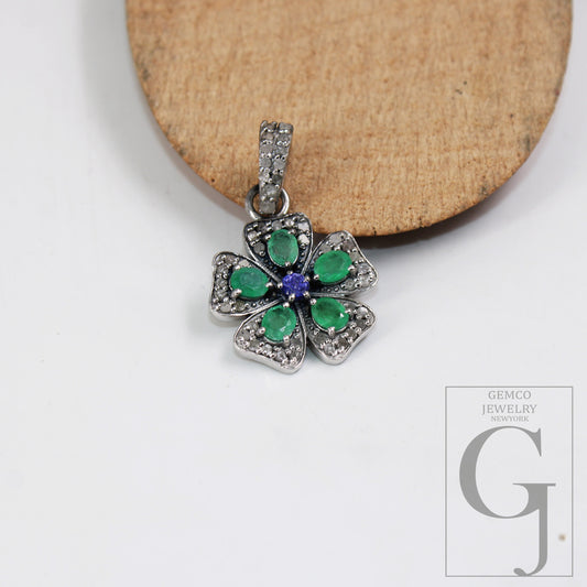Shiny silver natural emerald floral pendant designer Rosecut pave diamond pendant 925 sterling silver handmade diamond antique look pendent