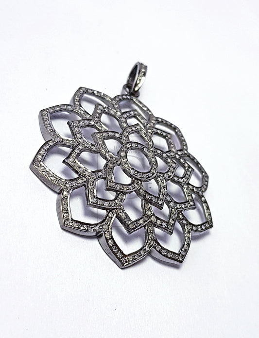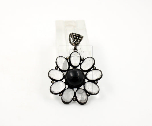 One Of A Kind Black Stone Flower Designer Rosecut Pave Diamond Pendant 925 Sterling Silver Handmade Finish Diamond Necklace Crystal Pendant