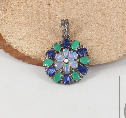 Flower Opal Emerald Kyanite Pendant Designer Rosecut Pave Diamond Pendant 925 Sterling Silver Handmade Finish Diamond Charm Necklace Pendant