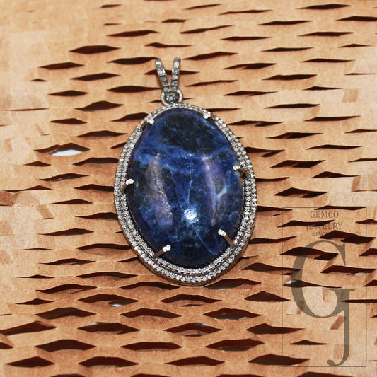 Sodalite Gemstone Healing Pendant Designer Rosecut Pave Diamond Pendant 925 Sterling Silver Handmade Finish Diamond Charms Necklace Pendant
