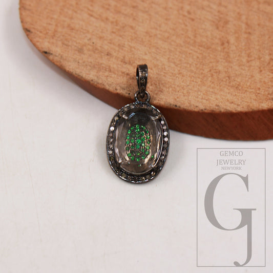 Beautiful Designer Rosecut Pave Diamond Pendant 925 Sterling Silver Handmade Finish Natural Oval Crystal Stone Center Stone Diamond Jewelry