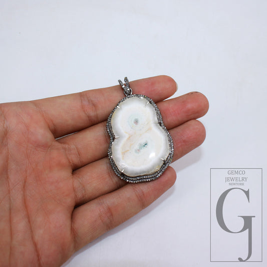 Druzy Agate Slice white SOLAR Agate pendant Rosecut pave diamond pendant 925 sterling silver handmade finish diamond charm necklace pendant