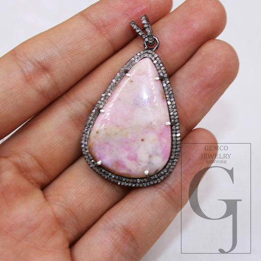 Beautiful Rose Pink Opal Pendant Necklace Rosecut Pave Diamond Pendant 925 Sterling Silver Handmade Finish Charm Diamond Pendant Jewelry