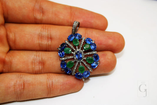 Beautiful Designer Emerald Kaynite Pendant Rosecut Pave Diamond Pendant 925 Sterling Silver Handmade Finish Diamond Charms Necklace Pendant