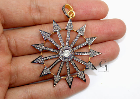 Beautiful Sunburst Designer Rosecut Pave Diamond Pendant 925 Sterling Silver Handmade Finish Polki Diamond Pendant Jewelry