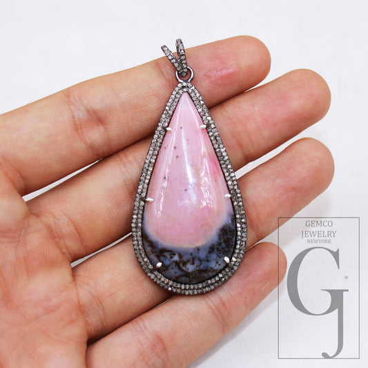 Beautiful Pink Opal Stone Pendant Rose Cut Pave Diamond Pendant 925 Sterling Silver Handmade Finish Pendant Pave Diamond Pendant Jewelry